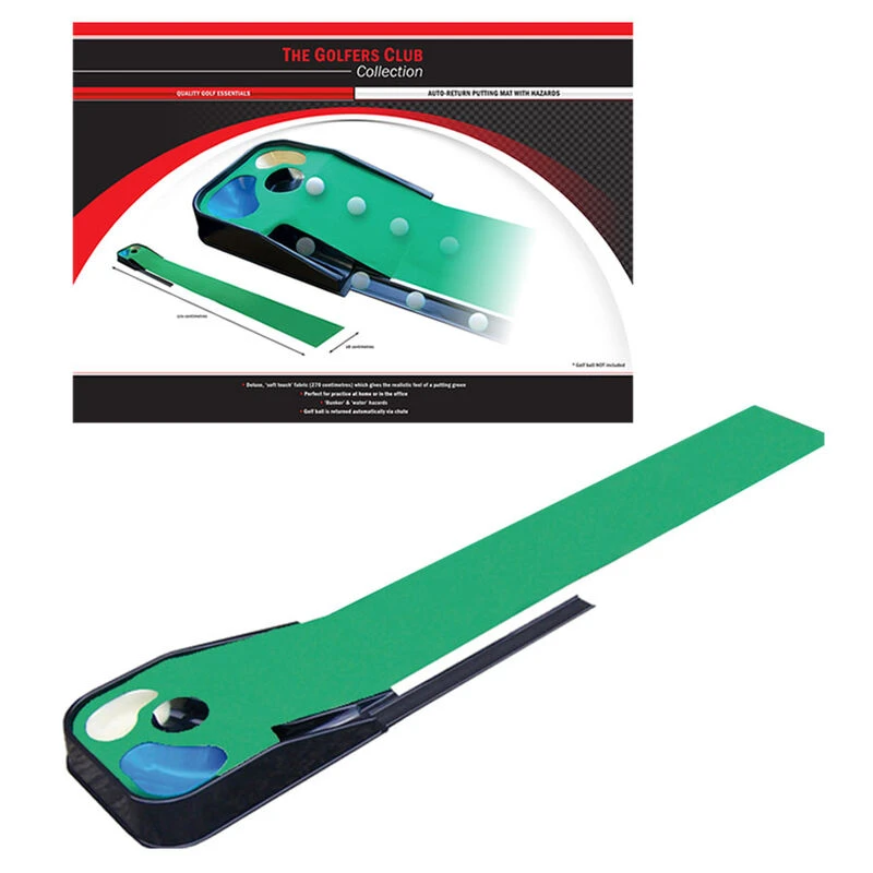 The soft-touch fabric of the mat provides the feel of a real putting surface. It has a standard-sized hole and includes bunker and water hazards. Golf balls are also returned via a chute at the side of the mat for convenience. The mat is perfect for use at home or the office and can be rolled up for easy storage.