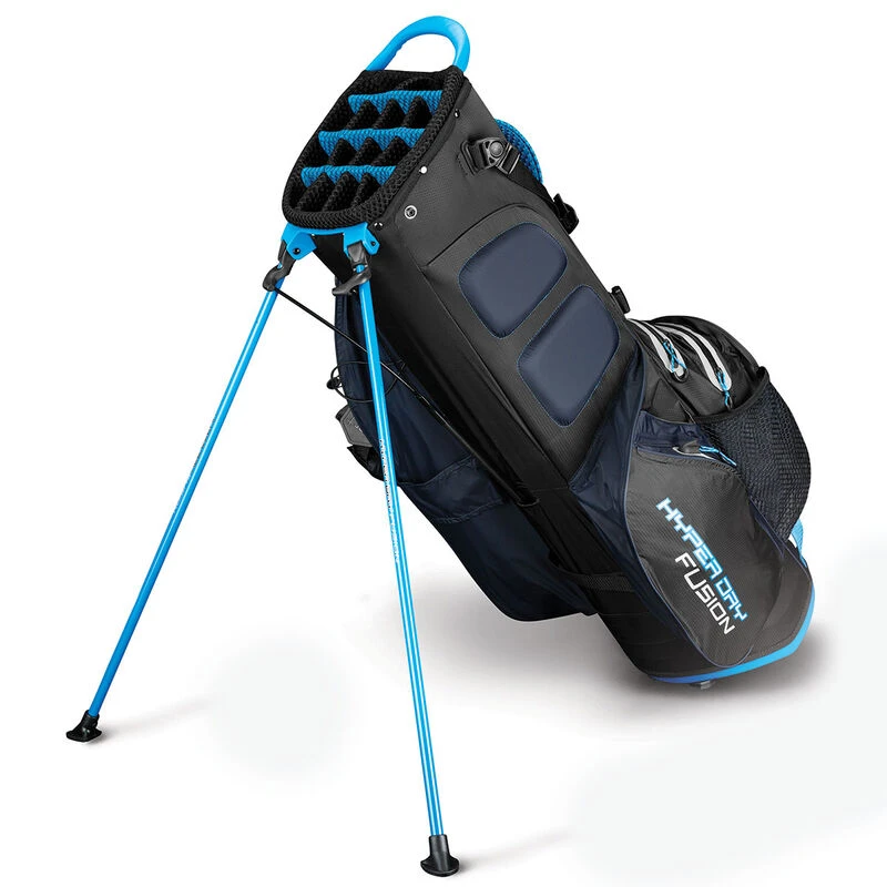 Play your round of golf with greater waterproof protection and organisation, with the outstanding HyperDry Fusion stand bag. With a 17% lighter construction than the previous model and fully seam-sealed to give 50% more waterproof protection. The golf bag is perfect for golfers who like the organisation of a trolley bag, and the functionality of a stand bag. Blending a 14-way top with full-length club dividers, and featuring a self-balancing X-Act Fit Strap System for an extremely comfortable to carry. The bag features plenty of storage space, with all over welded zips, this includes a custom logo ready ball pocket. Weight: 4.4lbs, and comes with matching rain hood.
