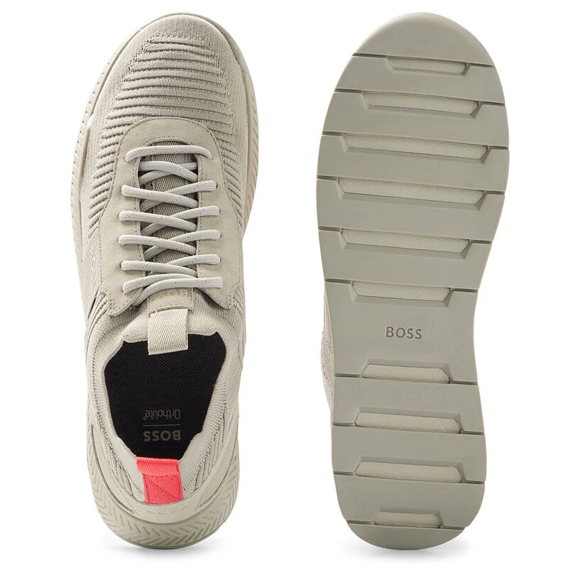 Premium trainers crafted from a structured-knit upper for breathable comfort with a BOSS branded tongue, side panel, and back tab to match. Made with REPREVE® fibres, a leading branded fibre made from recycled materials including PET bottles. Complete with a modern rubber outsole for traction, with BOSS details to assure a sporty look.
