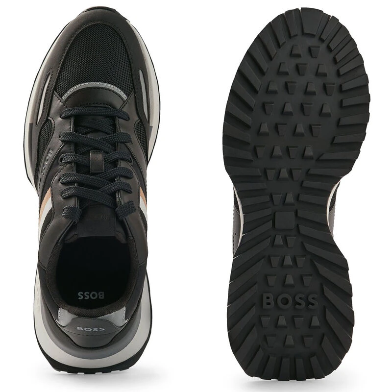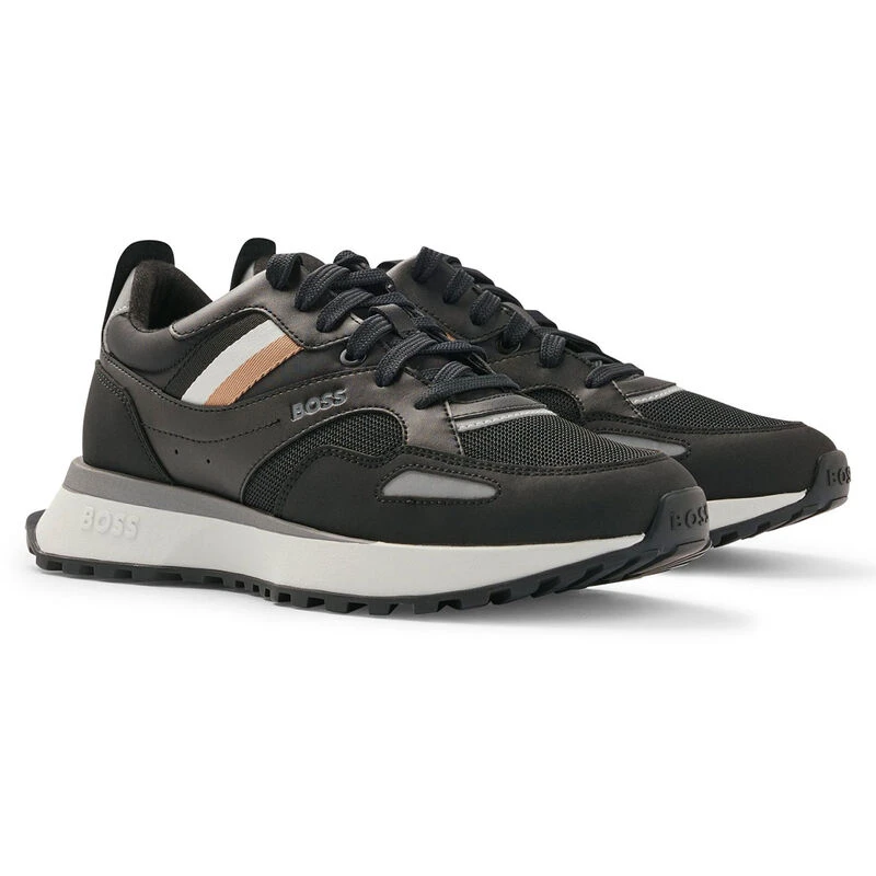 These sporty BOSS running-inspired trainers are designed with faux leather and mesh upper material for breathable comfort. Complete with a lightweight EVA midsole to provide comfort and extra cushioning. Plus a modern rubber outsole for traction, with rubberised BOSS details to assure a sporty look.