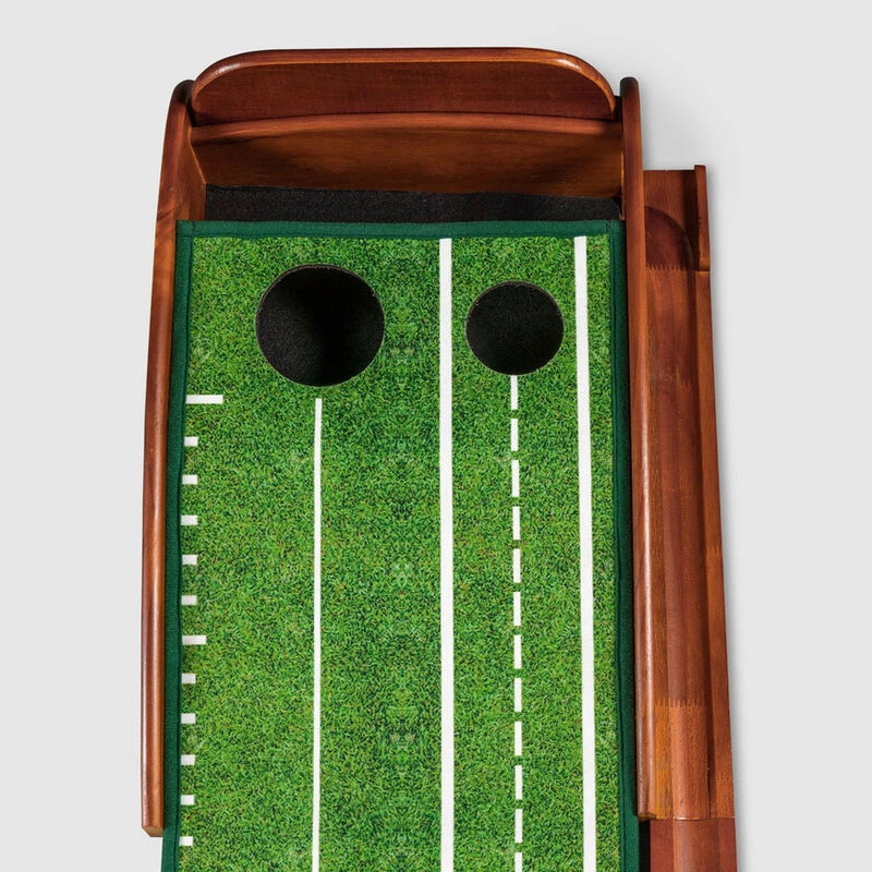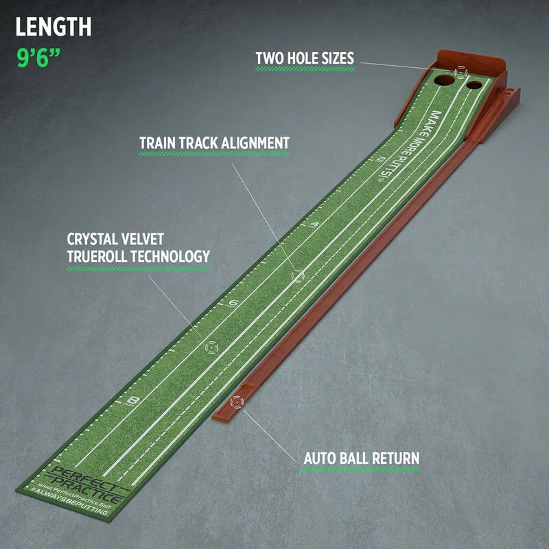 This premium putting 9ft 6″” mat has been constructed with Crystal Velvet Trueroll Technology to simulate real green putting conditions. It has 2 different sized holes to aim for, one regulation size and the other reduced for even more precision. Plus includes an auto ball return system to ensure your practice sessions are up to speed, without going to collect the golf ball over and again. The mat is highlighted with train track alignment lines and marked at, 2, 4, 6, 8 feet has an uphill section, and reads 10-14 on a stimp meter which is fast paced.