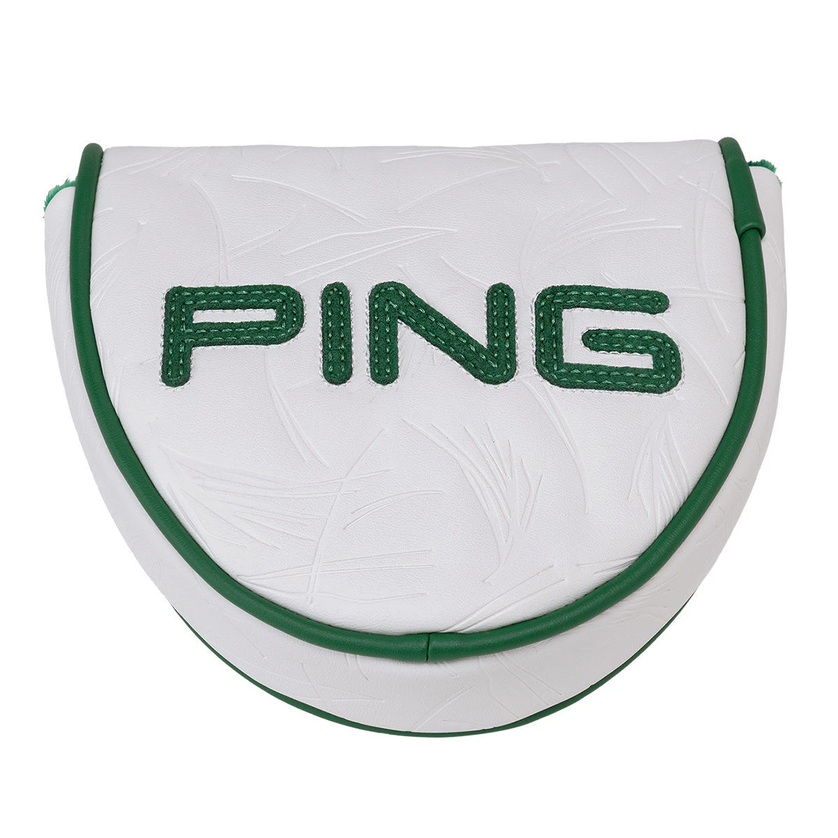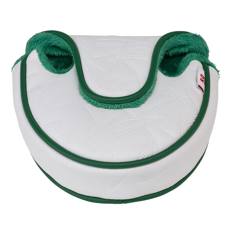 This high-quality polyurethane putter head cover is fitted with a soft green-coloured velour inside lining to care for your putter. It has a magnetic closure that allows you to attach to another club while in play and conveniently secures the cover in place. The cover is for use with suitable mallet putters and is highlighted with a debossed pine straw pattern, sewn on PING letter patches, plus a 59 woven label tab on the side.