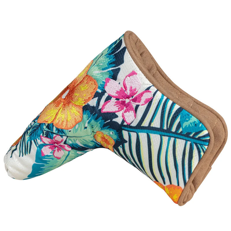 Make your blade extraordinary, under a Paradaiso tropical scene. It comes complete with a microfiber leather lining, a magnetic closure, and a special embroidered flower among its bright flora and fauna exterior. Made of durable, easy-to-clean polyurethane, so it retains its good looks over many, many rounds. The cover is highlighted with a sewn-on MR PING shield patch to add a touch of class.