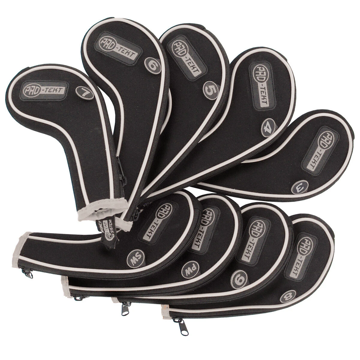 Care and protect your expensive iron set with these high-quality neoprene head covers. The set ranges from 3-SW, a total of 9 individual neoprene head covers that provide a snug and protective fit over your expensive irons. They are durable and stretchy and have a zip closure to secure them individually to every club. The set comes packaged in a retail box and are highlighted with Pro-Tekt brand logos and iron numbers for easy club selection.