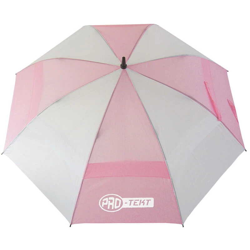 This wind-resistant golf umbrella has a dual-canopy design to allow wind to pass through. It has a strong lightweight fibreglass frame and shaft and has an ergonomic handle to ensure top performance. For added convenience, the umbrella has an automatic open function and comes with a protective sleeve. The umbrella is highlighted with a Pro-Tekt brand logo.