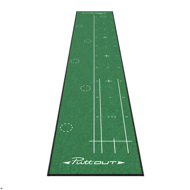 Practise makes perfect, with the highly durable PuttOUT putting mat. This nylon mat with heavy-duty rubber backing ensures you can practice your putting anytime and anywhere. The mat has a stimpmeter reading of 10, to replicate a medium to fast-paced green, with alignment lines and foot markers.