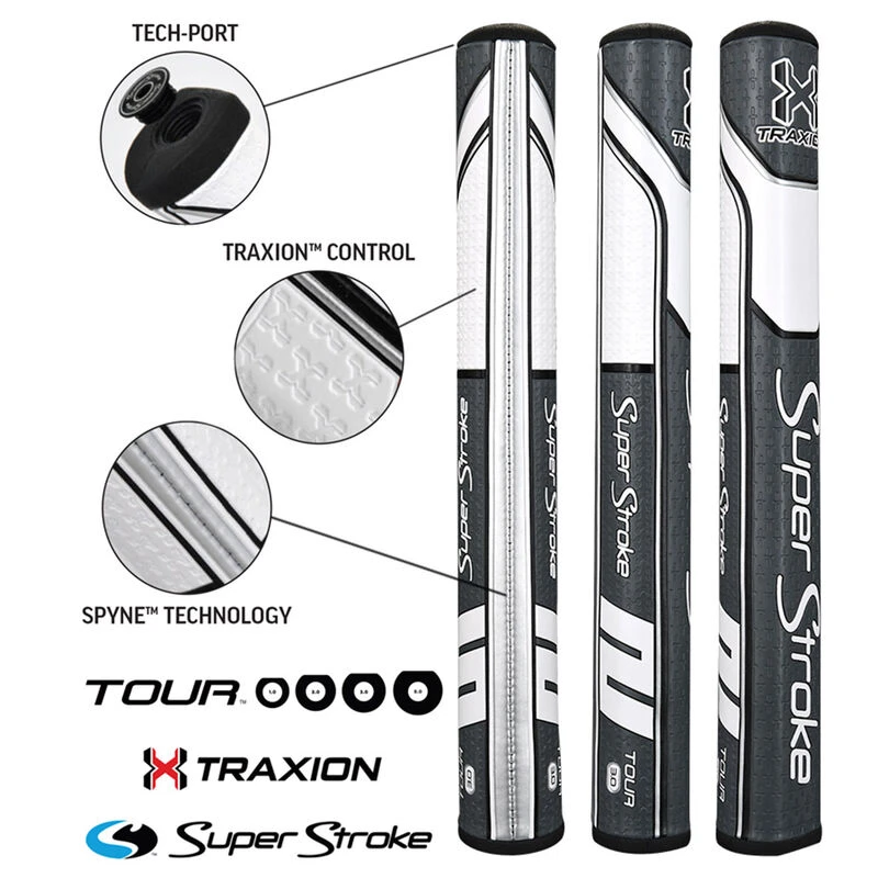This putter grip style is SuperStrokes best selling putter grip, now refined with Traxionâ„¢ Control, and Spyneâ„¢ Technology to improve feel and consistency. Fitted with a new Tech-Port to add extra SuperStroke accessories such as the CounterCore weight system.